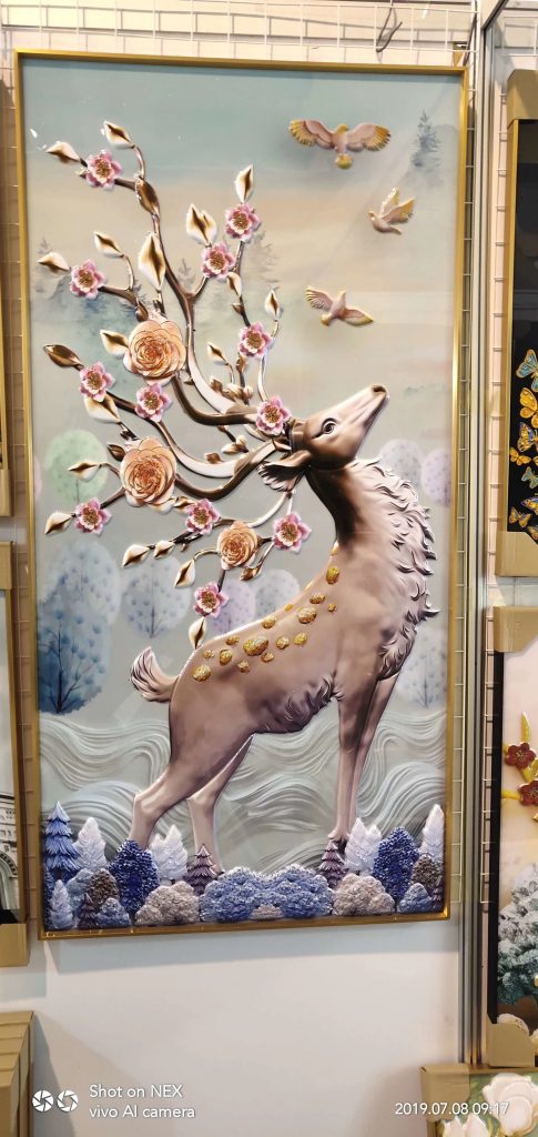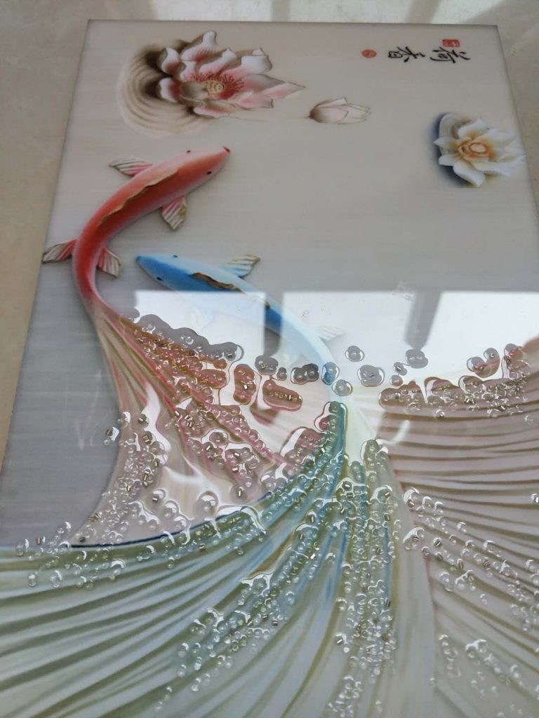 晶瓷畫是新創(chuàng)造的名稱,其工藝很新穎,表面光亮,似瓷似晶。晶瓷畫是采用優(yōu)等密度板配合優(yōu)等水晶材料,利用弘益機械設(shè)備的烤瓷機,使畫和水晶材料渾然一體后,跟密度板致密結(jié)合。其實這種表面烤瓷并不高檔,應該結(jié)合陰刻、貼箔、鑲嵌、手繪,成畫后再在表面涂層,或者稱為復一層晶瓷,這樣的畫才會顯得輕奢和高級。